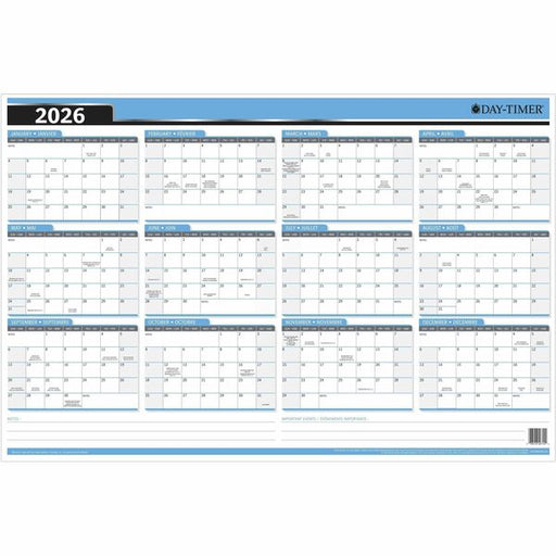 DayTimer Yearly Laminated Reversable Wall Calendar, 24" x 36" , Bilingual - Yearly, Monthly, Weekly - 12 Month - January 2026 to December 2026 - 36" (914.40 mm) x 24" (609.60 mm) Sheet Size - Wall Mount - Blue - Paper Cover - Reversible, Flexible, Write o