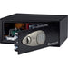 Electronic Security Safe secures most laptops and other valuables from theft. Design features electronic lock with override key and two live-locking bolts, carpeted floor, concealed hinges and armored steel construction for a formidable deterrent against theft and loss. Safe includes bolt-down hardware for added security. Capacity is 0.7 cubic feet (24 cubic liters). Interior dimensions are 16-3/4" wide x 12-5/8" deep x 6-15/16" high (42-3/5cm wide x 32cm deep x 17-2/5cm high). Safe weighs 26.7 lb. (12.1 kg.).