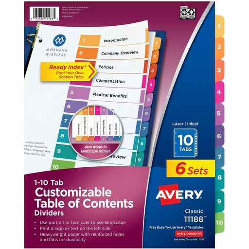 Avery® Ready Index® Table of Content Dividersfor Laser and Inkjet Printers, 10 tabs, 6 sets - 60 x Divider(s) - 60 Printed Tab(s) - Digit - 1-10 - 10 Tab(s)/Set - 8.50" (215.90 mm) Divider Width x 11" (279.40 mm) Divider Length - 3 Hole Punched -