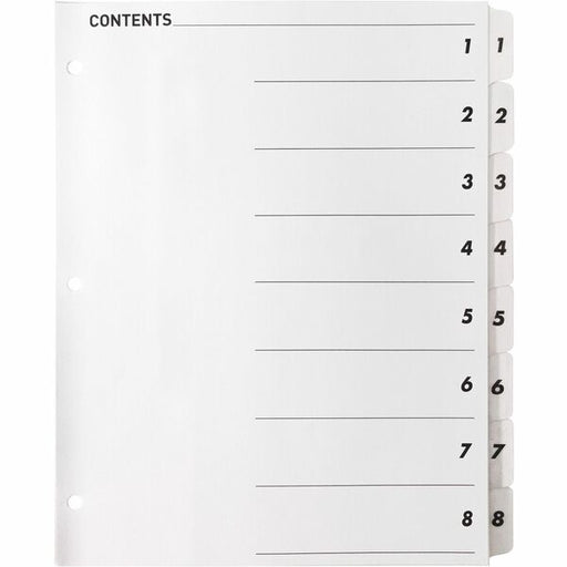 Business Source Table of Content Quick Index Dividers - Printed Tab(s) - Digit - 1-8 - 8 Tab(s)/Set - 8.50" (215.90 mm) Divider Width x 11" (279.40 mm) Divider Length - 3 Hole Punched - White Divider - White Mylar Tab(s) - 8 / Set