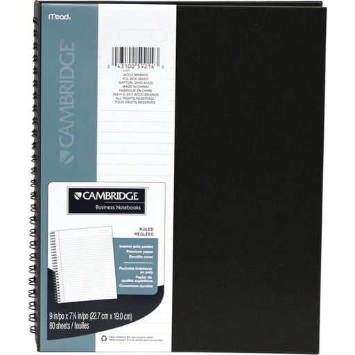 Cambridge Notebook - 80 Sheets - 160 Pages - Wire Bound - Ruled Margin - 9" (228.60 mm) x 7 1/4" (184.15 mm) Sheet Size - Hard Cover, Textured, Pocket - Recycled - 1 Each