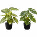 Bring natural style and beauty to your home and office space with this stunning pair of indoor artificial plants. This set of 2 consists of a 13" tall monstera and calathea potted plant, with multi-hued green leaves for a real-look touch and feel. The detailed large leaves are adjustable to create the desired fullness for a realistic look. These faux plants are made with high-quality and durable materials so you can create the perfect balance of greenery to accent a tabletop for an indoor space. Best of all, they require no maintenance and no watering, making them an environmentally friendly and a no-fuss way to add nature to your home. The plants are firmly cemented in 4" plain black pots and aesthetically pleasing to place on a table without fear of water marks. This faux foliage set of 2 is the perfect decorative accent for the home or office, offering a beautiful and no-fuss way to bring the outdoors in.