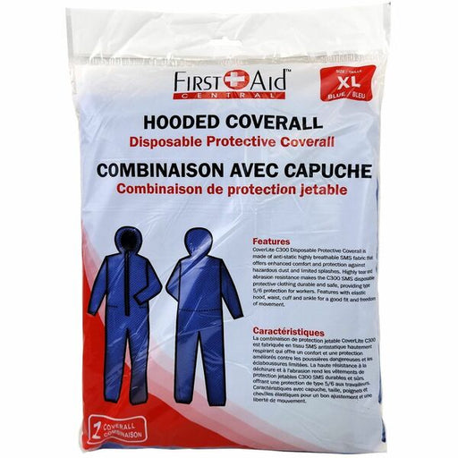 First Aid Central Disposable Hooded Coverall (XL) - Extra Large - Dust, Splash Protection - Zipper Closure - SMS, Polypropylene, Fabric - Blue - Disposable, Anti-static, Breathable, Comfortable, Tear Resistant, Abrasion Resistant, Elastic Hood, Elastic Wa