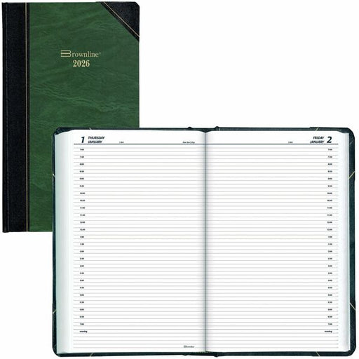 Blueline Traditional Daily Planner, 13-3/8" x 8" , English, Green - Daily - 12 Month - January 2026 to December 2026 - 7:00 AM to 7:30 AM Half-hourly - 1 Day Single Page Layout - 8" (203.20 mm) x 13 3/8" (339.73 mm) Sheet Size - Sewn - Black, Green - Pape