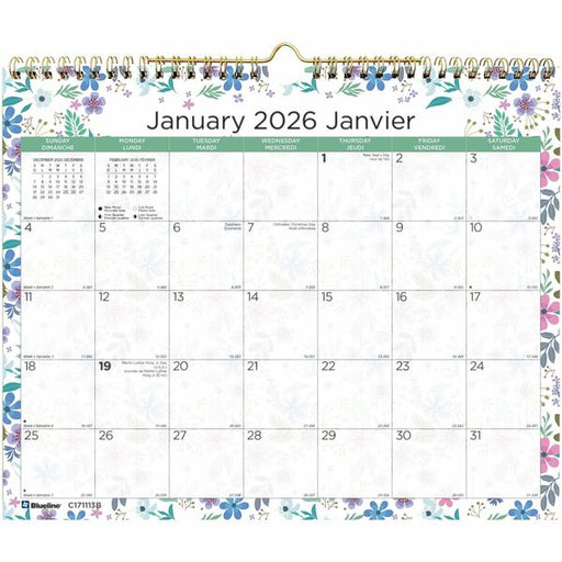 Blueline Wildflowers Monthly Wall Calendar. 15" x 12" , Bilingual - Monthly - 12 Month - January 2026 to December 2026 - 1 Month Single Page Layout - 12" (304.80 mm) x 15" (381 mm) Sheet Size - Twin Wire - Wall Mount - White - Chipboard - Bilingual, Reinf