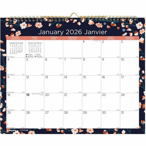 Blueline Twilight Floral Monthly Wall Calendar. 15" x 12" , Bilingual - Monthly - 12 Month - January 2026 to December 2026 - 1 Month Single Page Layout - 12" (304.80 mm) x 15" (381 mm) Sheet Size - Twin Wire - Wall Mount - White - Chipboard - Floral Desig