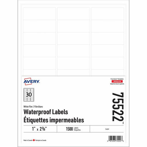 Avery Rectangle Waterproof Labels with Sure Feed Technology - Waterproof - 1" (25.40 mm) Width x 2 5/8" (66.55 mm) Length - Permanent Adhesive - Rectangle - Laser - White - Film - Water Resistant - Tear Resistant, Scuff Resistant, Durable, Smudge Resistan