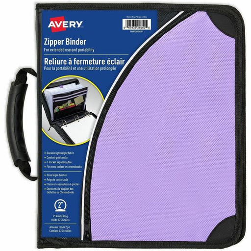 Avery Purple Zipper Binder - 375 Sheet Capacity - 2 4/5" (71.12 mm) Spine Width - 3 x 2" (50.80 mm) Ring(s) - Fastener(s): 3 x Round Ring - Pocket(s): 6 - Fabric - Purple - Document Holder, Storage Pocket, Zipper Closure, Expandable, Notebook, Sturdy, Han