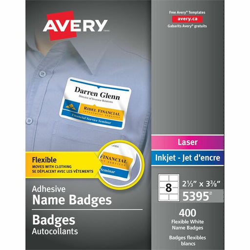 Avery® Flexible Name Badgesfor Laser and Inkjet Printers, 3-3/8" x 2-1/3" , White - 2 1/3" (59.26 mm) Height x 3 3/8" (85.73 mm) Width - Removable Adhesive - Rectangle - Laser, Inkjet - Matte - White - Film - 8 / Sheet - 50 Total Sheets - 400 Total La
