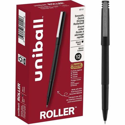 uniball™ Roller Rollerball Pen - Micro Pen Point - 0.5 mm Pen Point Size - Black Water Based Ink - Black Stainless Steel Barrel - 1 Dozen