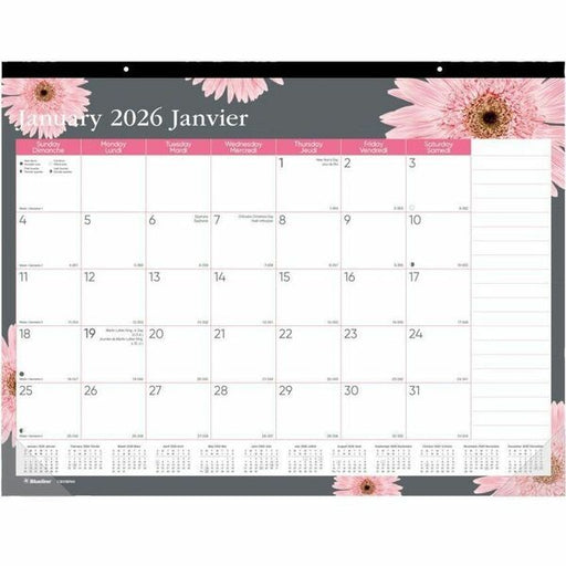 Blueline Pink Daisy Monthly Desk Pad Calendar, 22" x 17" , Bilingual - Monthly, Yearly - 12 Month - January 2026 to December 2026 - 1 Month Single Page Layout - 17" (431.80 mm) x 22" (558.80 mm) Sheet Size - 2 x Holes - Desk Pad - Clear - Vinyl, Chipboard