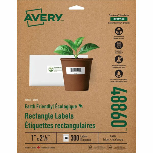 Avery® Eco-Friendly Address Labelsfor Laser and Inkjet Printers, 1" x 2?" - 1" (25.40 mm) Width x 2 5/8" (66.68 mm) Length - Permanent Adhesive - Rectangle - Laser, Inkjet - Matte - White - Paper - Recyclable, PVC-free, Permanent Adhesive, Customizabl