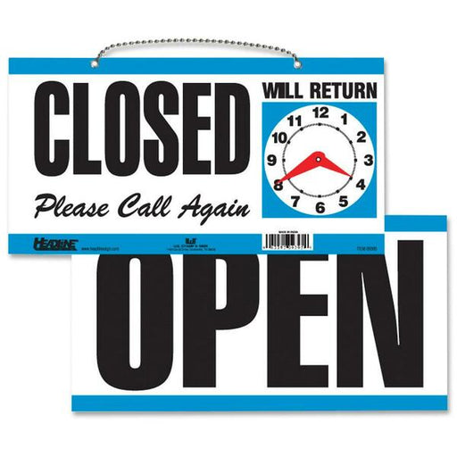 Headline Open/Closed 2-sided Sign - 1 Each - English - Open, CLOSED, Please Call Again, Will Return Print/Message - 11.50" (292.10 mm) Width x 6" (152.40 mm) Height - Rectangular Shape - Customizable Time - Indoor, Outdoor - White, Blue
