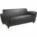 Marketing Information:Sofa is part of the modern, Lorell Accession Collection that is made with an open, inviting design and bonded black leather. Back meets the seat at a slightly obtuse angle for a relaxing experience while waiting. Raised sides provide comfortable armrests. Thick foam cushions are CA117 fire-retardant. Four sturdy, wooden legs with a Mahogany finish support the sofa built for three. Overall weight capacity is 650 lb. with a 215 lb. capacity for each seat.