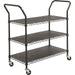 Strong, three-shelf, wire utility cart transports and stores material safely and efficiently. Each shelf holds 200 lb. for an overall weight capacity of 600 lb. Shelf clearance is 12" high. Cart rolls smoothly on four swivel, 3" nylon casters (two locking). Shelves adjust easily in 1" increments. A black plastic shelf liner is included for each shelf. Wire is made of powder-coated steel.