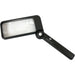 Handheld rectangular magnifier contains a lightweight, shatterproof acrylic lens with 2X main magnification and a 4X bifocal inset. Design allows it to fold compactly for storage. Magnifier includes a vinyl case.